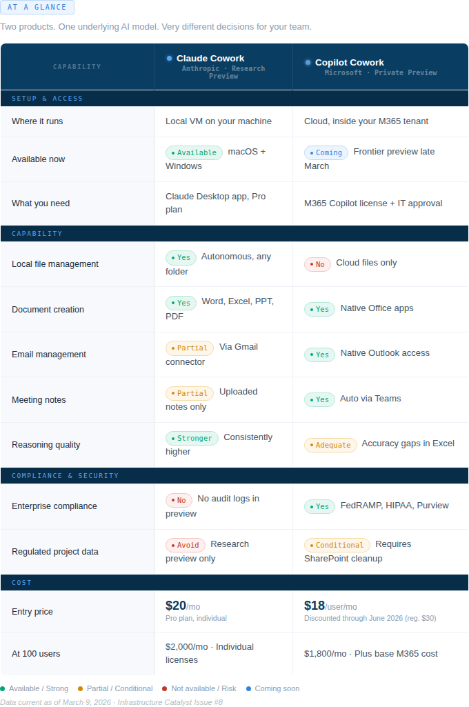 Anthropic launched Cowork on January 12, 2026 as a research preview. Software stocks dropped $285 billion the same day. Microsoft had their own version embedded inside Microsoft 365 57 days later. Most infrastructure firms have not caught up to either announcement yet. That gap is exactly where the advantage is right now.