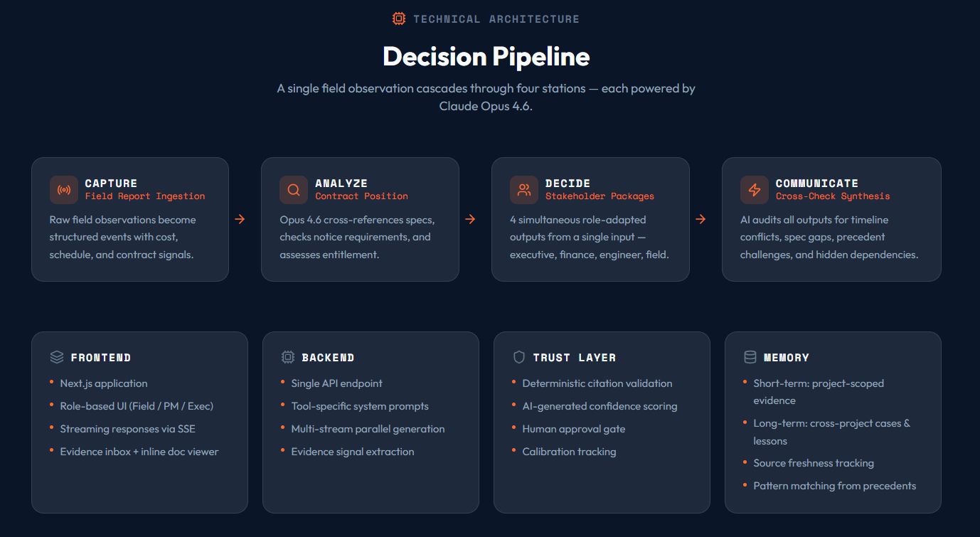 I built ICelerate, a decision intelligence tool for infrastructure PMs. It takes the data we already generate (field observations, contracts, specs, RFIs) and produces role-adapted, contract-aware outputs. The hero feature: type in one field condition, and four panels stream simultaneously with separate analyses for the Director, CFO, Engineer, and Contractor.